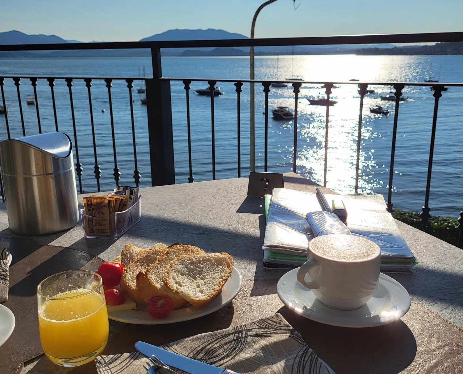 Italian breakfast includes not only coffee, freshly squeezed orange juice, a selection of meats and cheeses but also a delicious selection of cakes. All with panoramic views of the lake and the mountains.